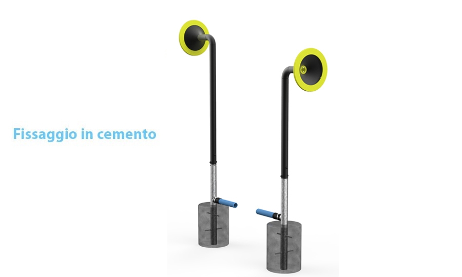 Lo strumento è disponibile solo con un fissaggio da terra. È dotato di un robusto tubo ondulato lungo fino a 15 metri. Questo tubo rende possibile impostare i componenti a qualsiasi distanza fino a 15 metri. Questo è l'accessorio dello strumento più professionale e stabile per superfici morbide (es. prati, sabbia).