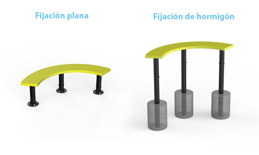 Un banco es una excelente adición a los instrumentos externos y aumentará la comodidad de la diversión y la música en el patio de juegos o en el parque. Crean complejos «circulo», «onda» y «s». Varios bancos facilitan la organización de asientos cómodos para un grupo de niños y sus cuidadores.